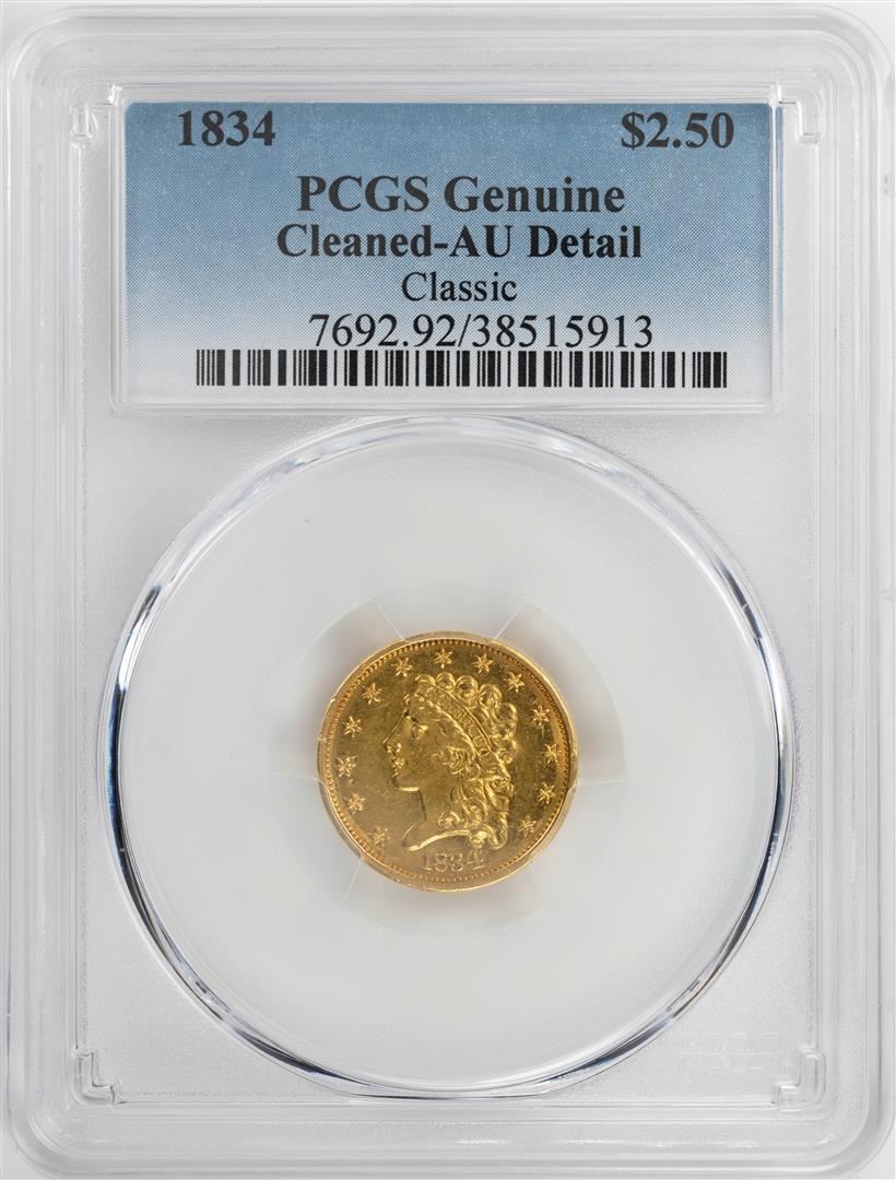 One 1834 $2 1/2 Classic Head Quarter Eagle Gold Coin PCGS Cleaned AU Details. PCGS Graded.