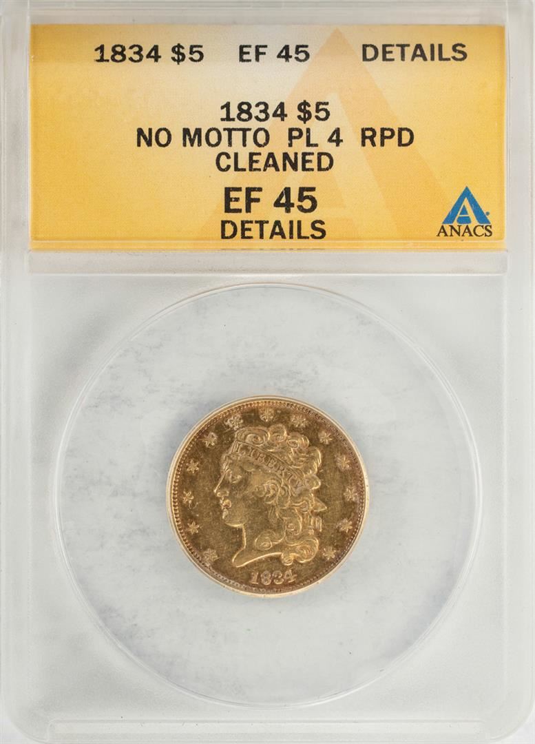 One 1834 $5 Classic Liberty Head Half Eagle Gold Coin No Motto ANACS EF 45 Details. ANACS Certified.