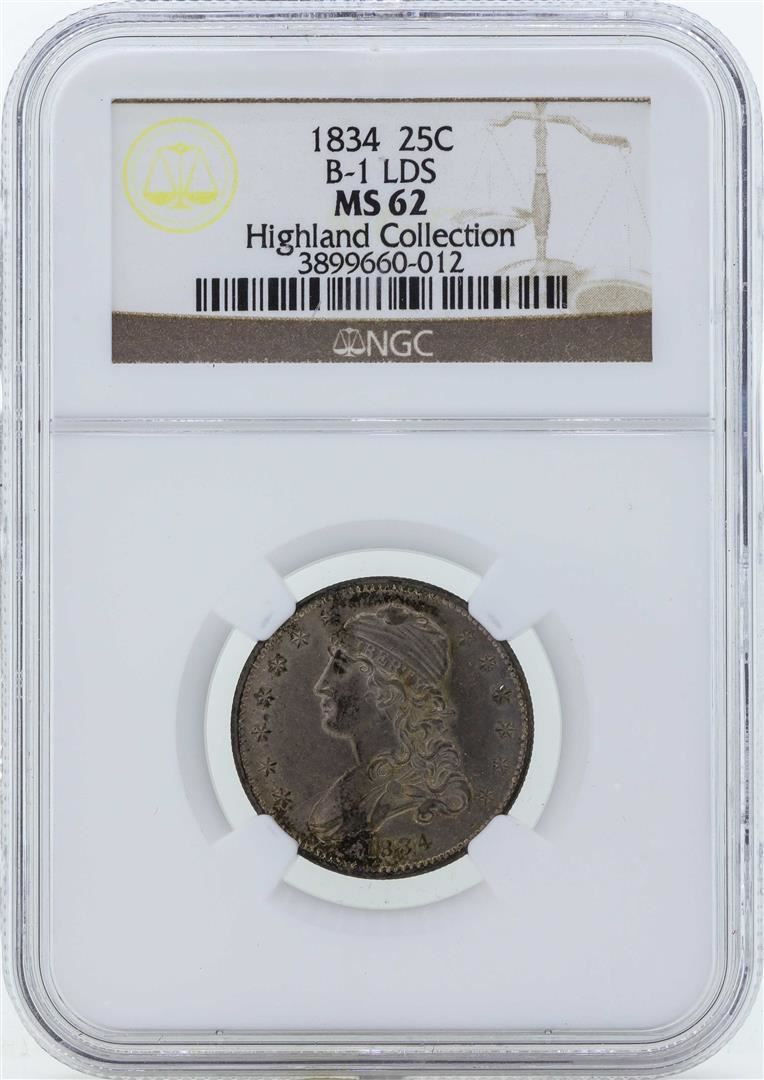 One 1834 Capped Bust Quarter B-1 LDS Coin NGC MS62. NGC Certified.