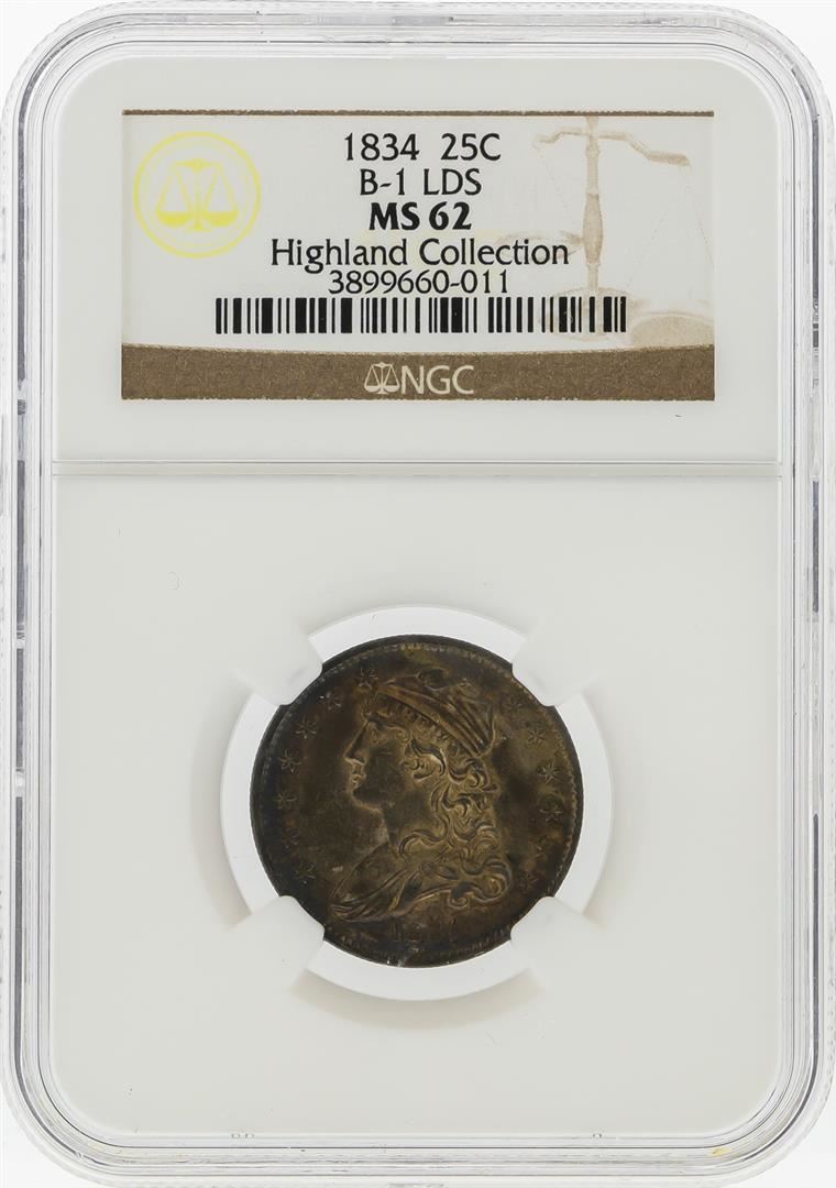 One 1834 Capped Bust Quarter B-1 LDS NGC Graded MS62. NGC Certified.