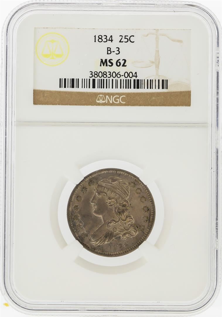 One 1834 Capped Bust Quarter B-3 LDS NGC Graded MS62. NGC Certified.