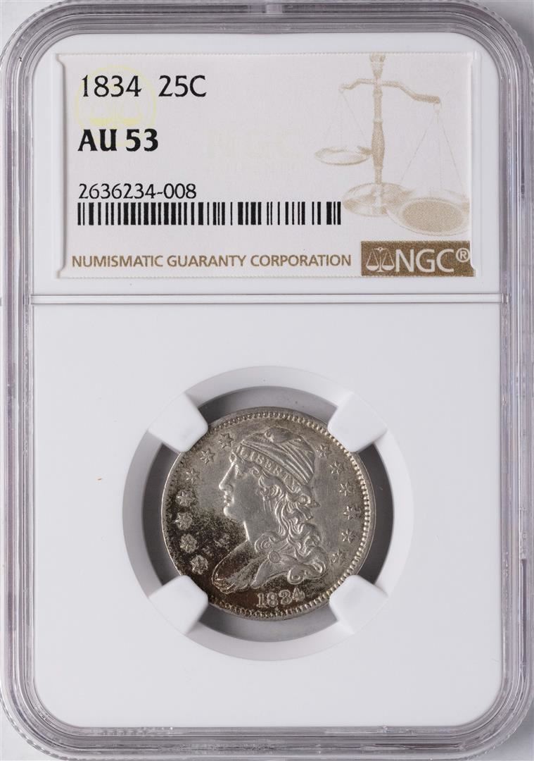 One 1834 Capped Bust Quarter Coin NGC AU53. NGC Certified.