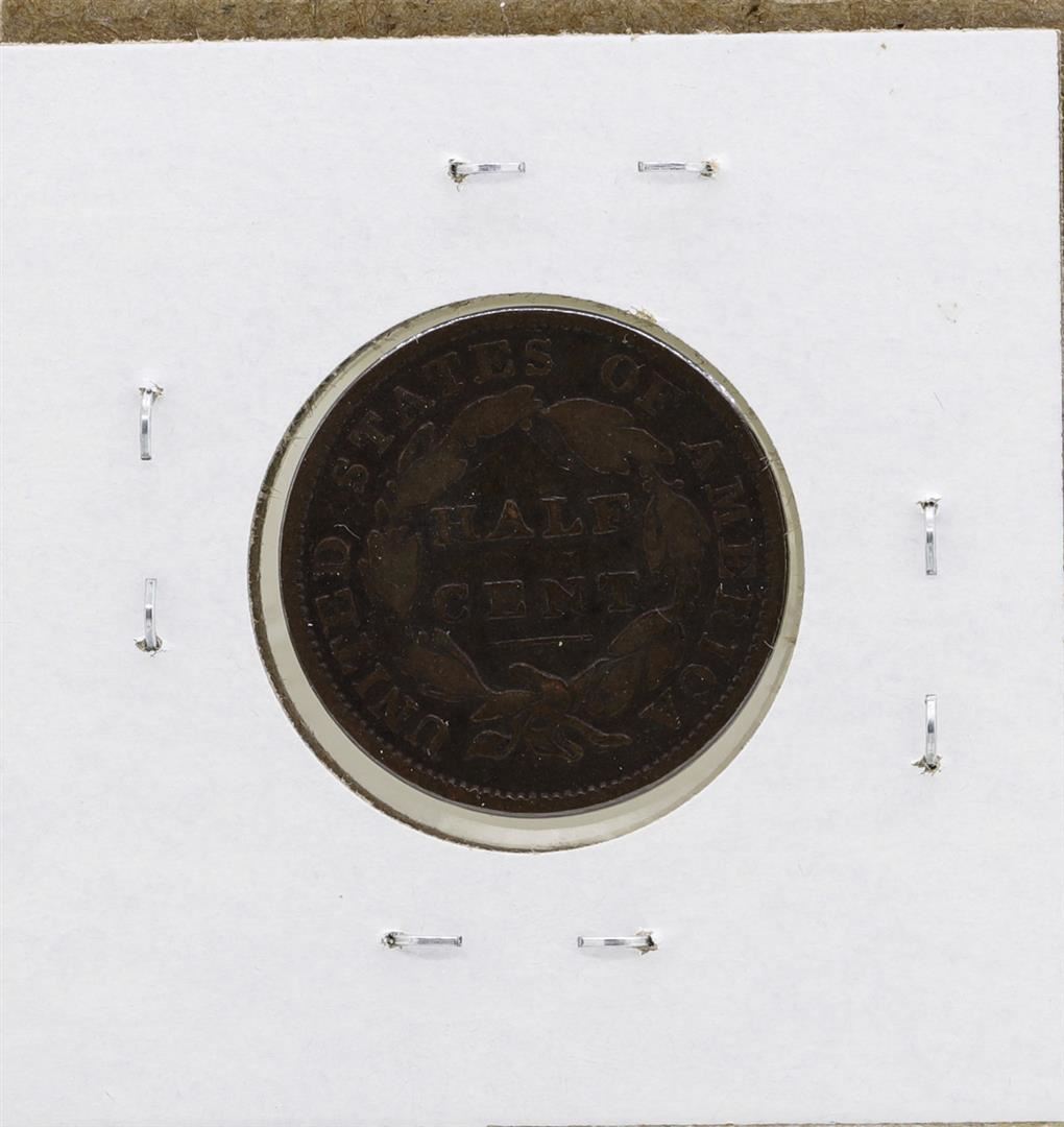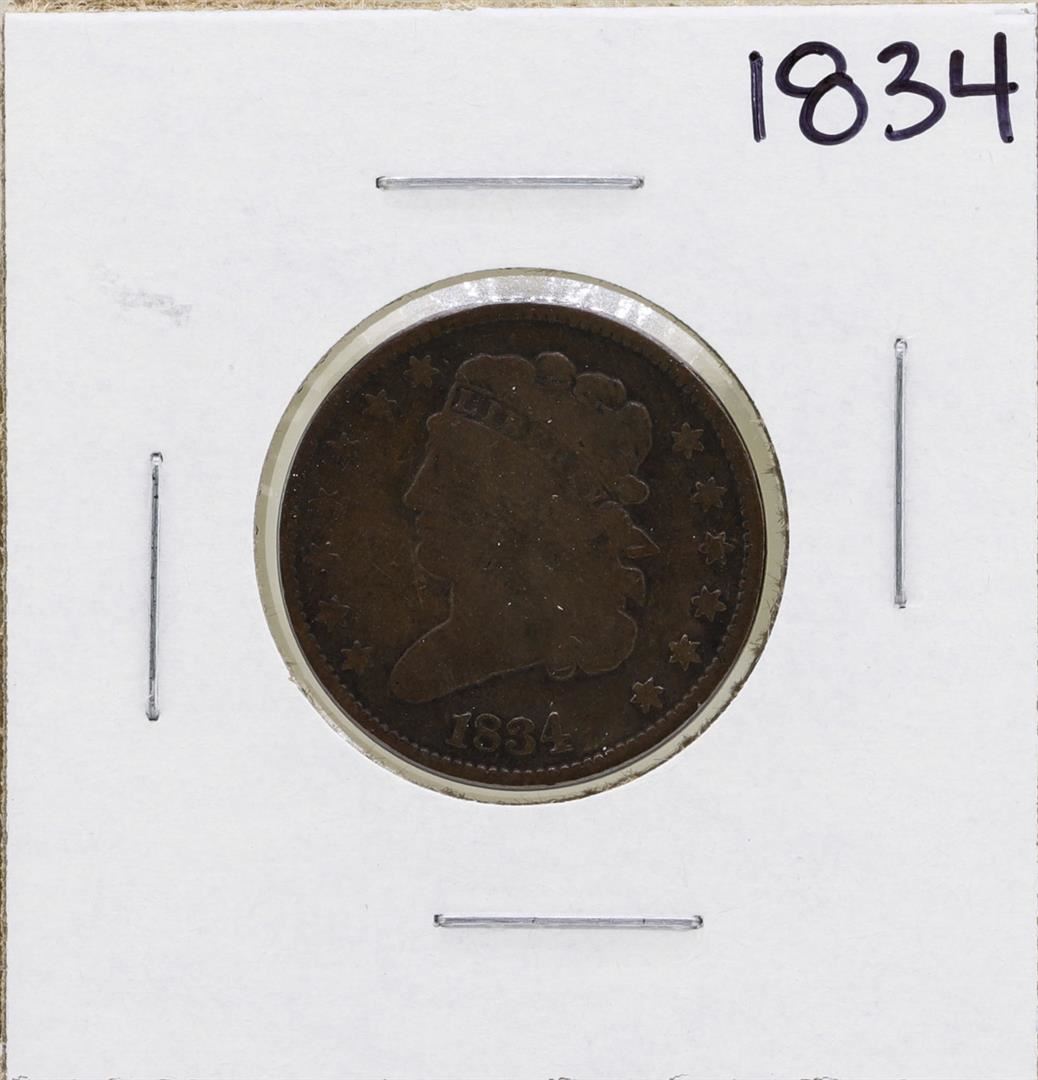 One 1834 Draped Bust Half Cent Coin.