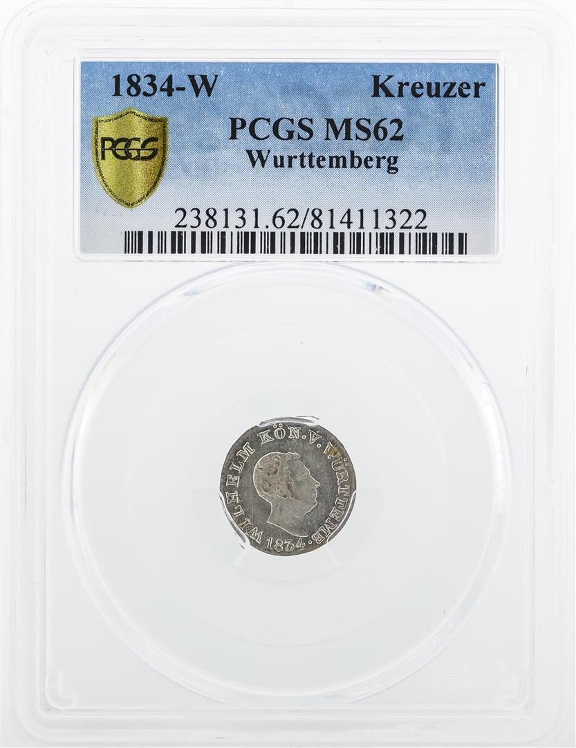 One 1834 Kreuzer Wurttemberg Coin PCGS MS62. PCGS Graded.