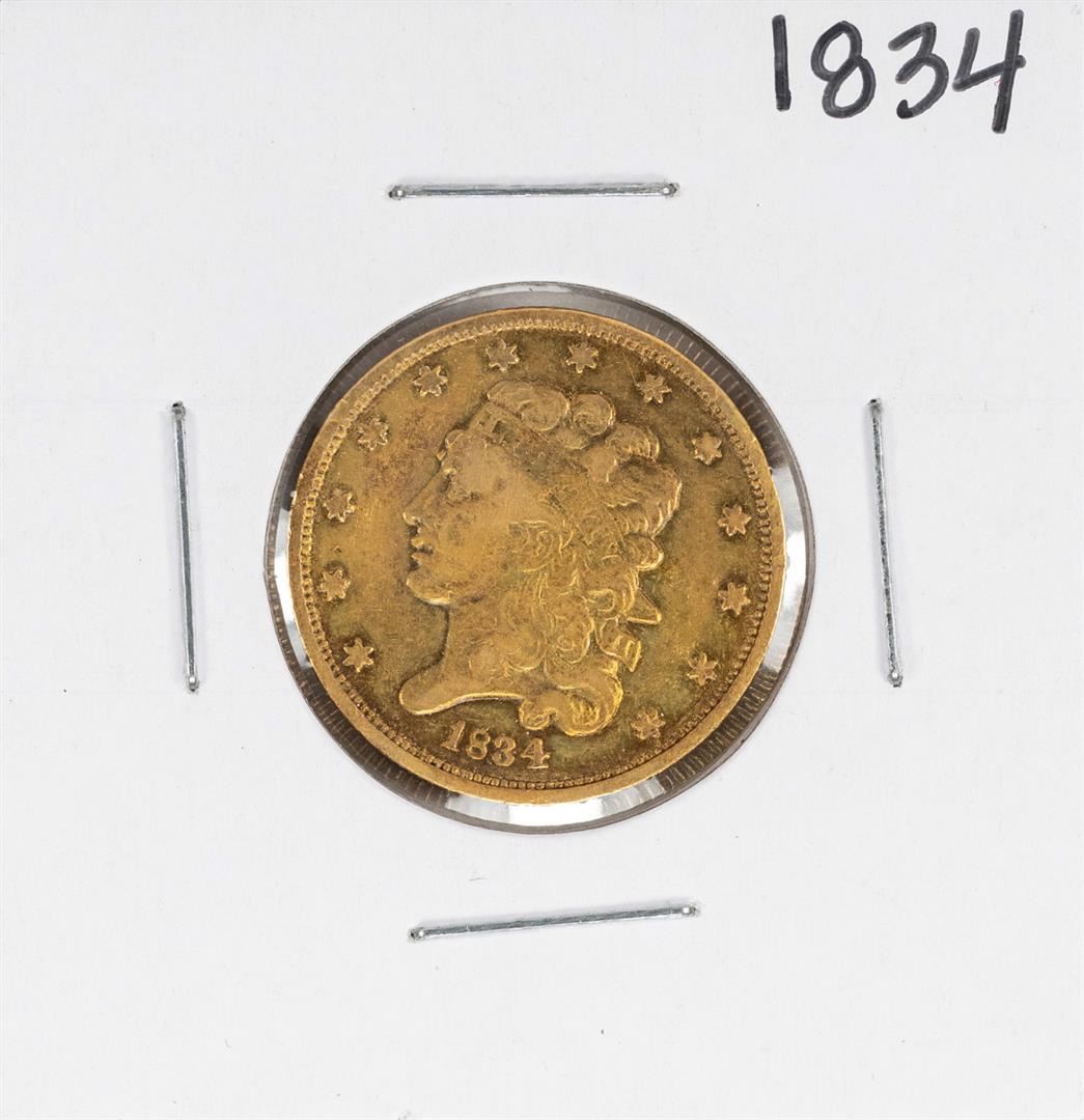 One 1834 Plain 4 $5 Classic Head Half Eagle Gold Coin.