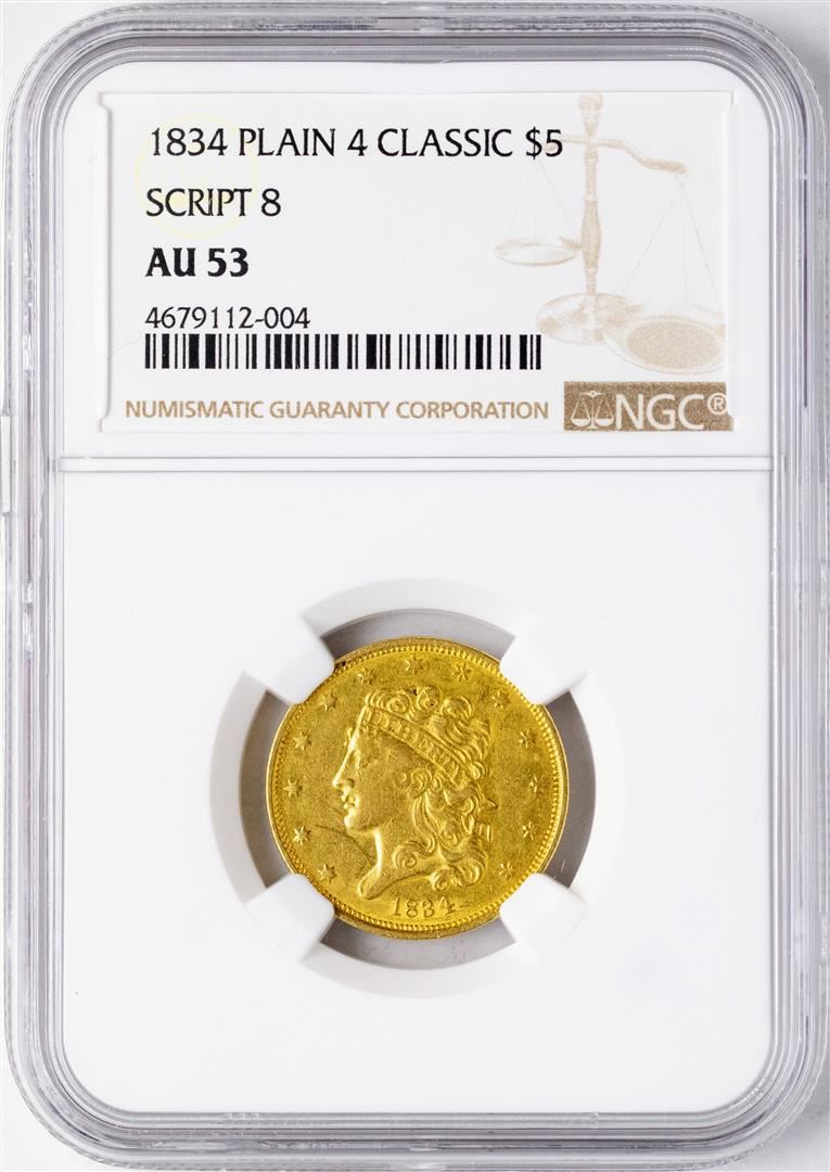 One 1834 Plain 4 Classic $5 Head Half Eagle Gold Coin NGC AU53 Script 8. NGC Certified.