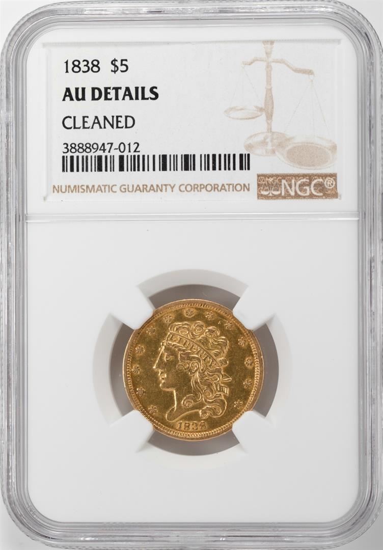 One 1835 $5 Classic Head Half Eagle Gold Coin NGC AU Details. NGC Certified.