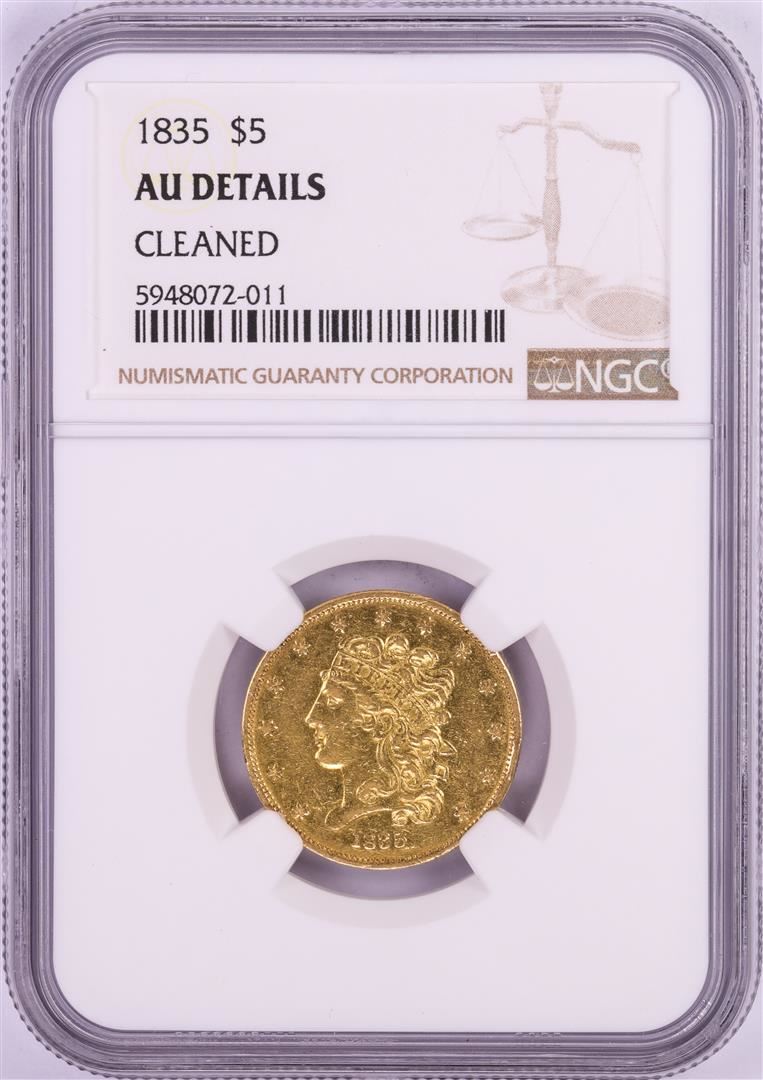 One 1835 $5 Classic Head Half Eagle Gold Coin NGC AU Details. NGC Certified.