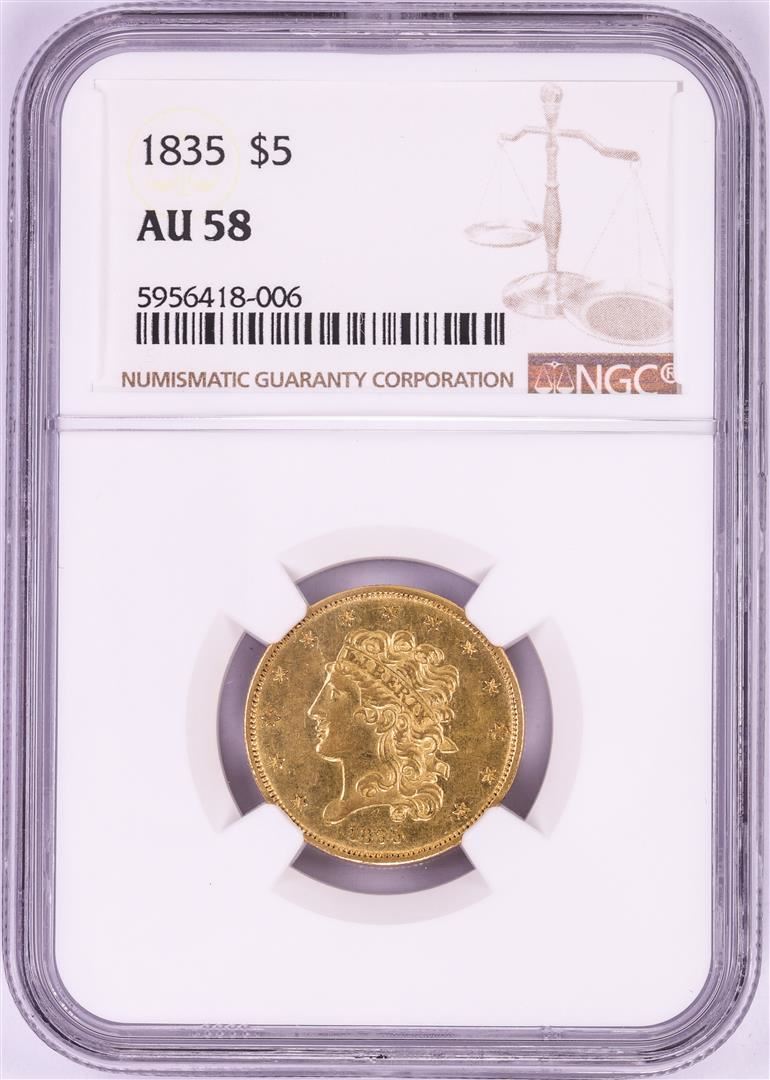 One 1835 $5 Classic Head Half Eagle Gold Coin NGC AU58. NGC Certified.