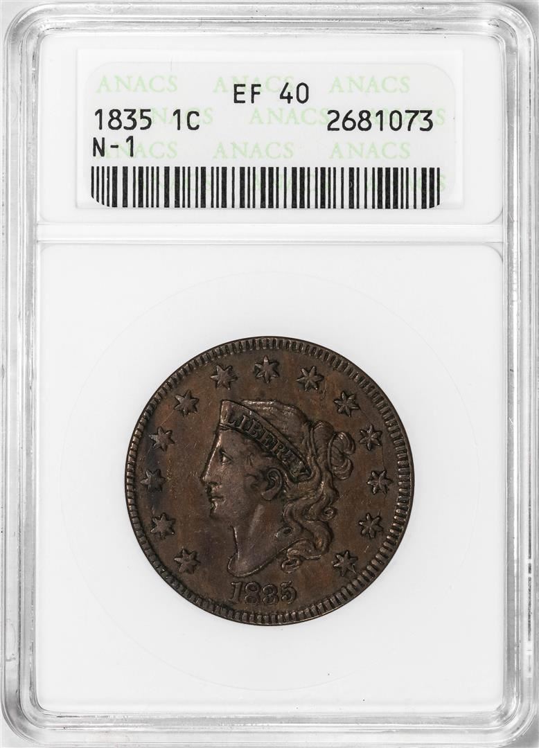 One 1835 N-1 Coronet Head Large Cent Coin ANACS EF40. ANACS Certified.