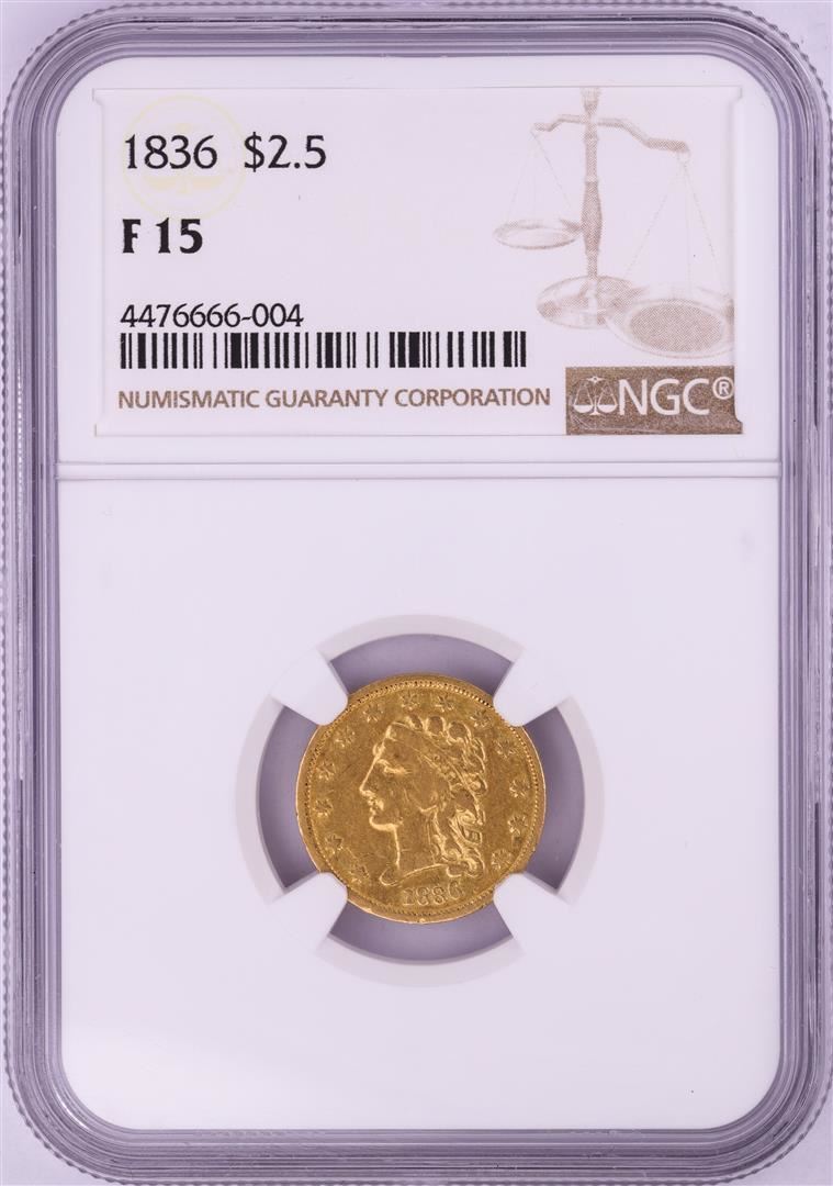 One 1836 $2 1/2 Classic Head Quarter Eagle Gold Coin NGC F15. NGC Certified.