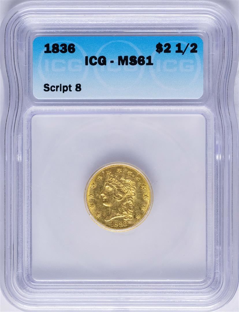 One 1836 $2 1/2 Classic Head Quarter Eagle Gold Coin Script 8 ICG MS61. ICG Certified.