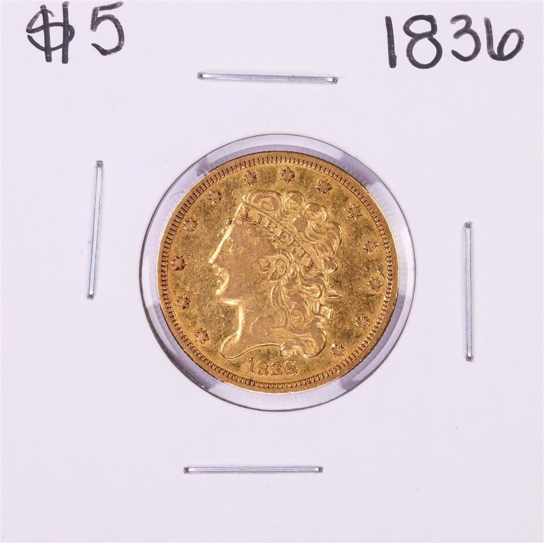 One 1836 $5 Classic Head Half Eagle Gold Coin.