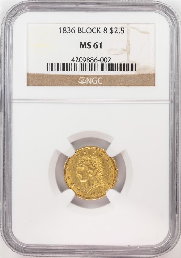 One 1836 Block 8 $2 1/2 Classic Head Quarter Eagle Gold Coin NGC MS61. NGC Certified.
