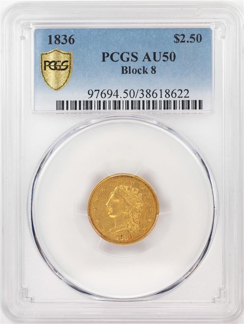 One 1836 Block 8 $2 1/2 Classic Head Quarter Eagle Gold Coin PCGS AU50. PCGS Graded.