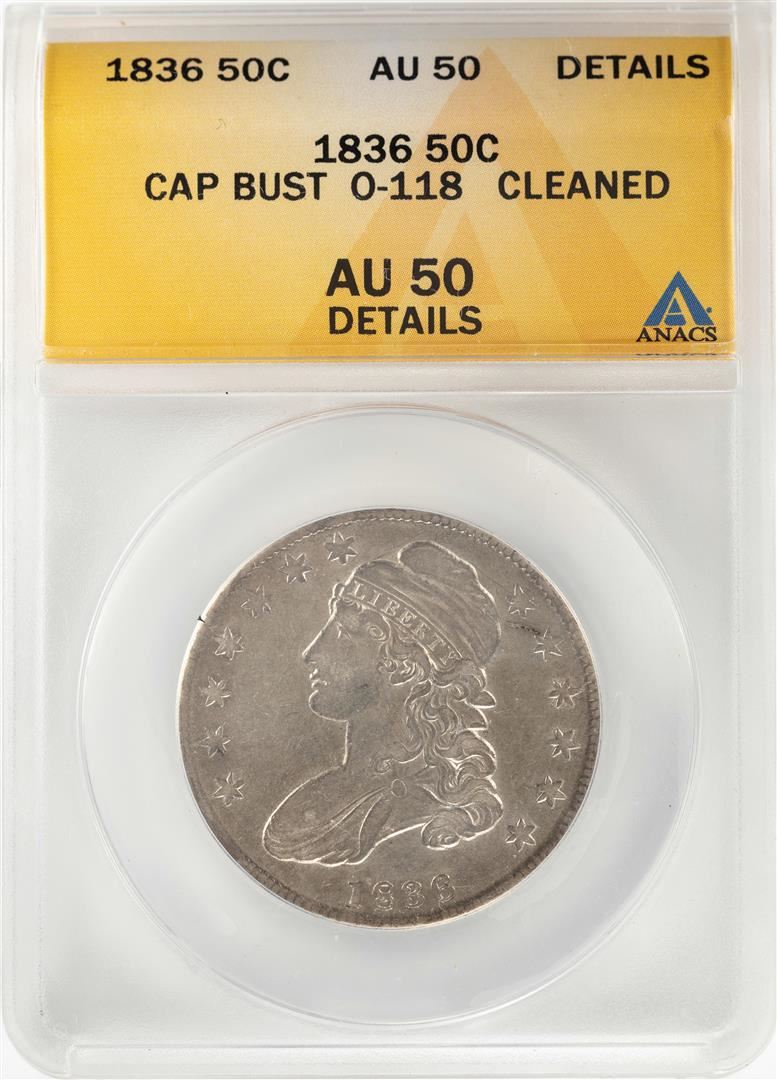 One 1836 Capped Bust Half Dollar Coin ANACS AU50 Details O-118. ANACS Certified.