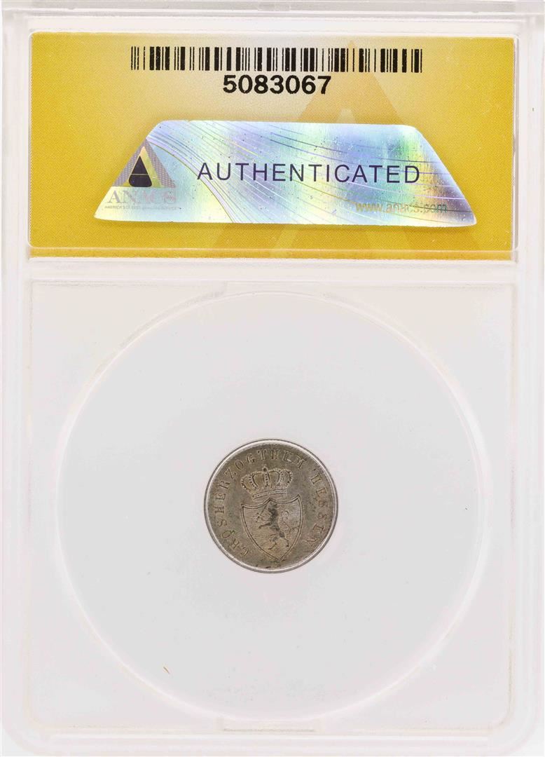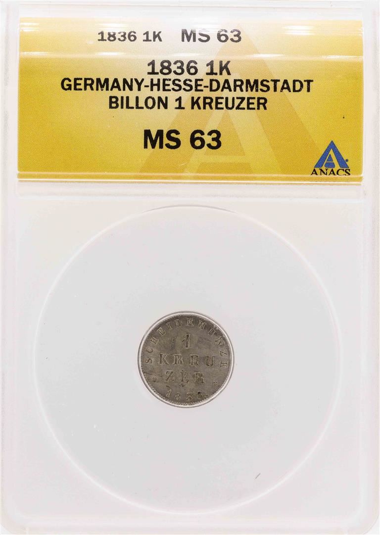 One 1836 Germany-Hesse-Darmstadt Billion Kreuzer Coin ANACS MS63. ANACS Certified.