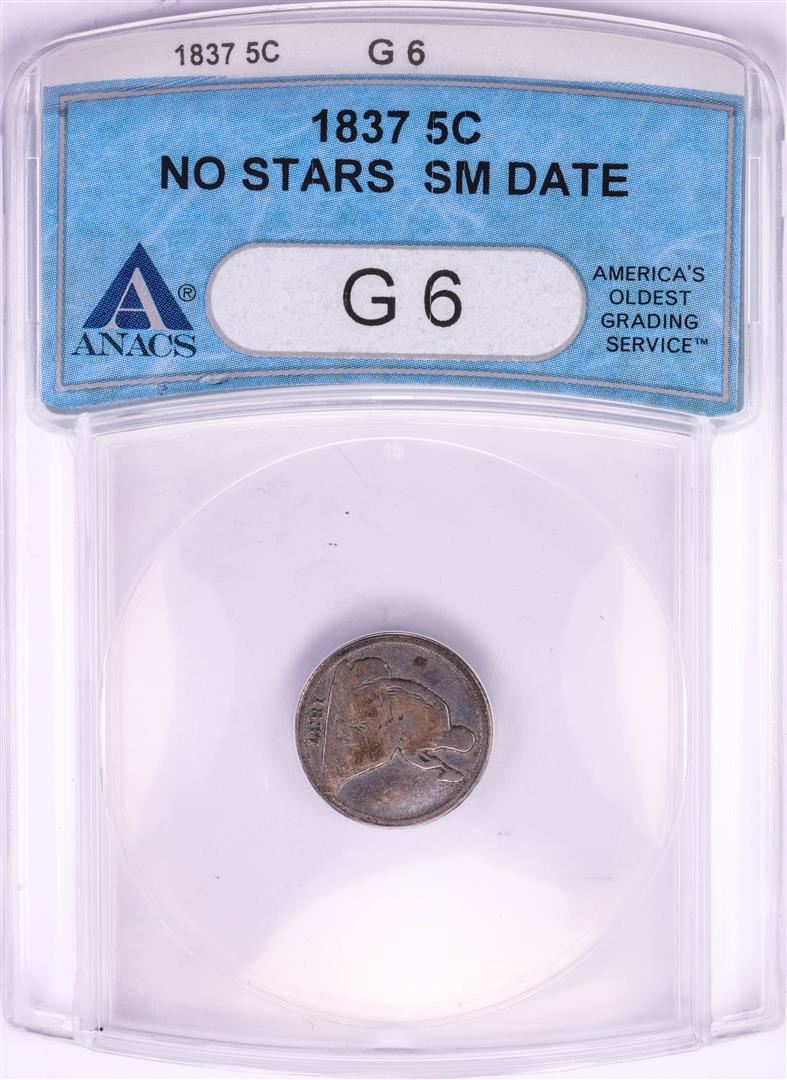 One 1837 No Stars Small Date Seated Liberty Half Dime Coin ANACS G6. ANACS Certified.