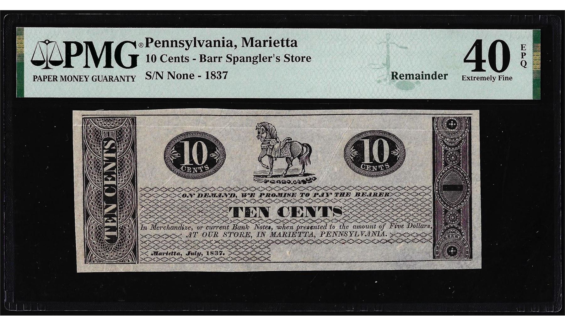 One 1837 Ten Cents Marietta, PA Barr Spangler's Remainder Note PMG Extremely Fine 40EPQ. PMG Certified.