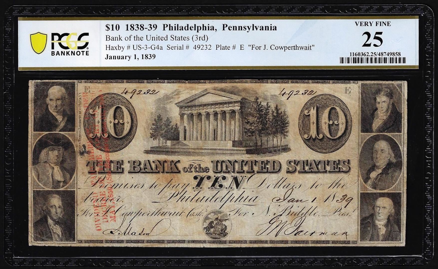 One 1838-1839 $10 Bank of the United States Philadelphia Obsolete Note PMG Very Fine 25. PCGS Graded.