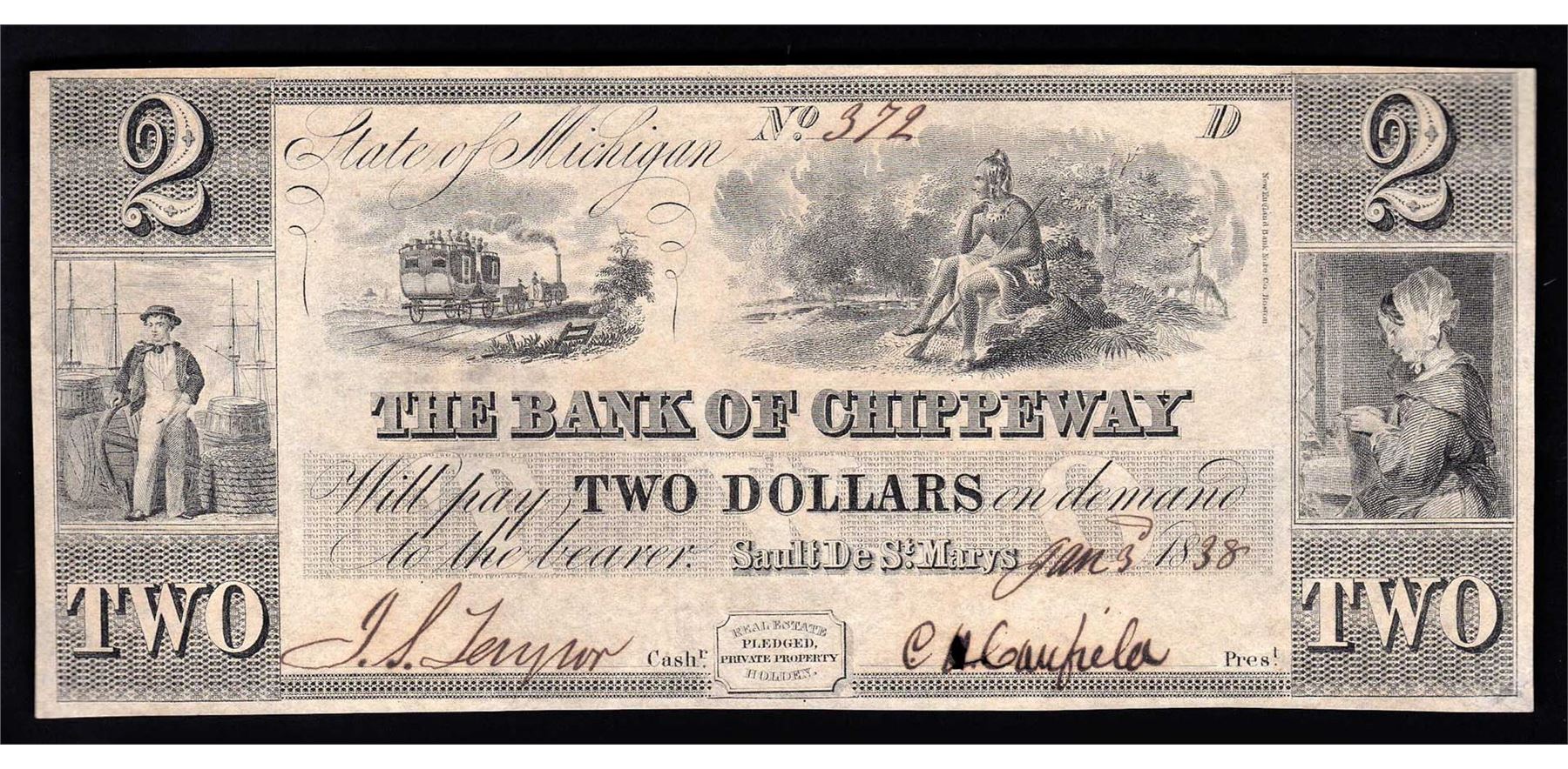 One 1838 $2 The Bank of Chippeway Obsolete Bank Note.
