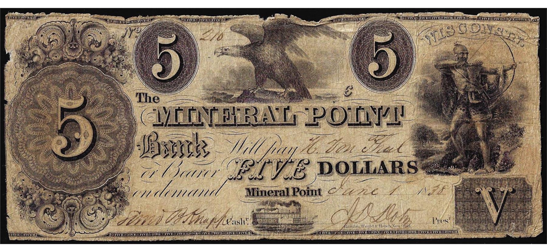 One 1838 $5 Mineral Point Bank Wisconsin Obsolete Note.