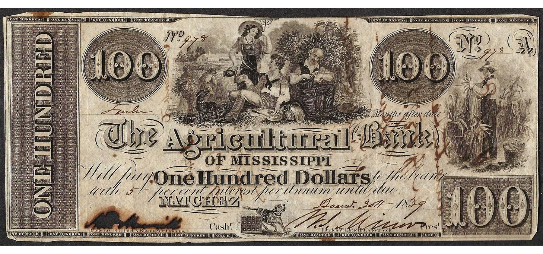 One 1839 $100 Agricultural Bank of Mississippi Natchez Obsolete Note.