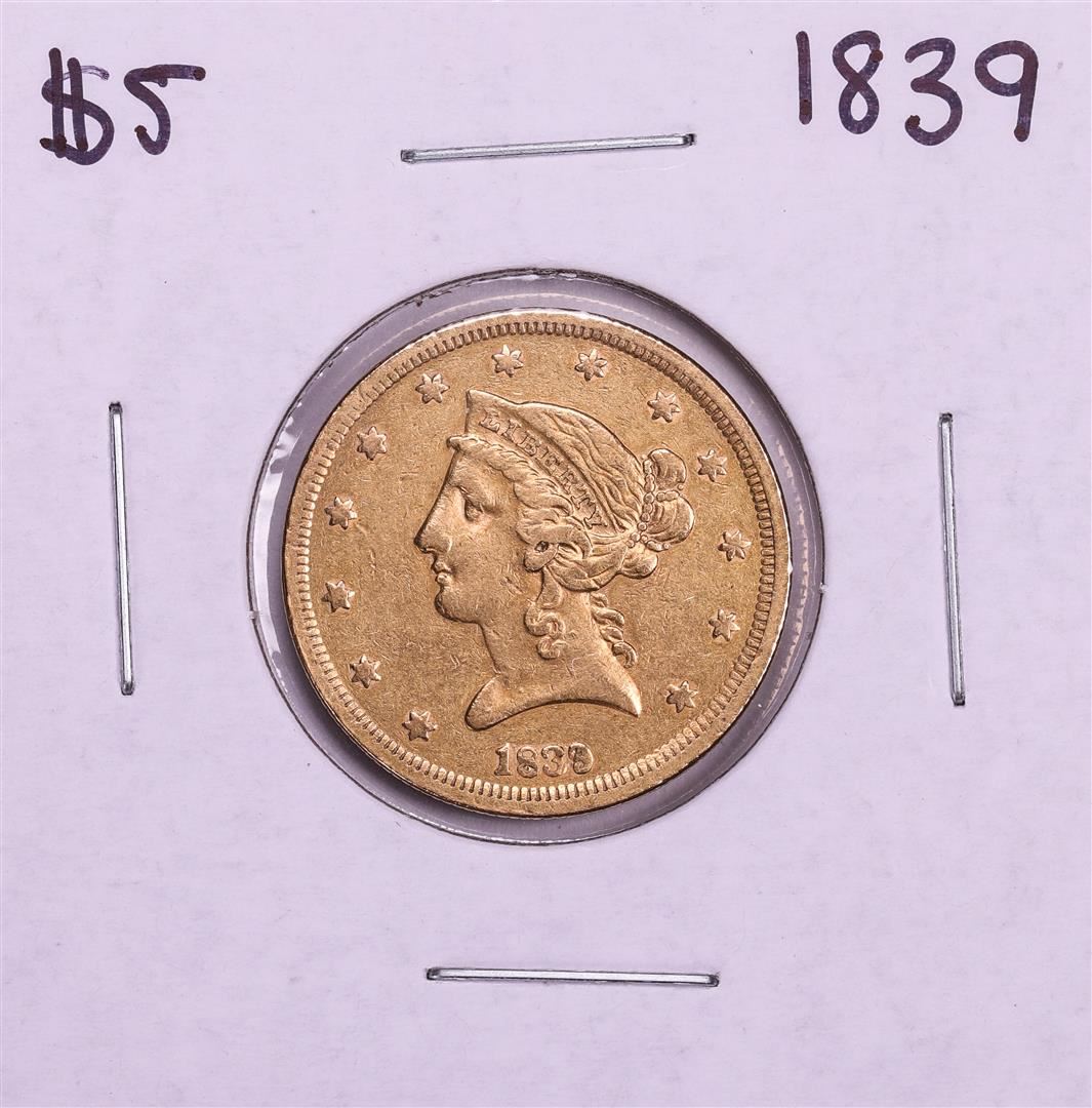 One 1839 $5 Liberty Head Half Eagle Gold Coin.