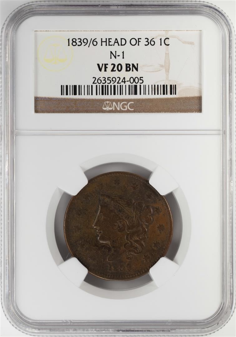 One 1839/6 Coronet Head of 36 Large Cent Coin NGC VF20 BN. NGC Certified.