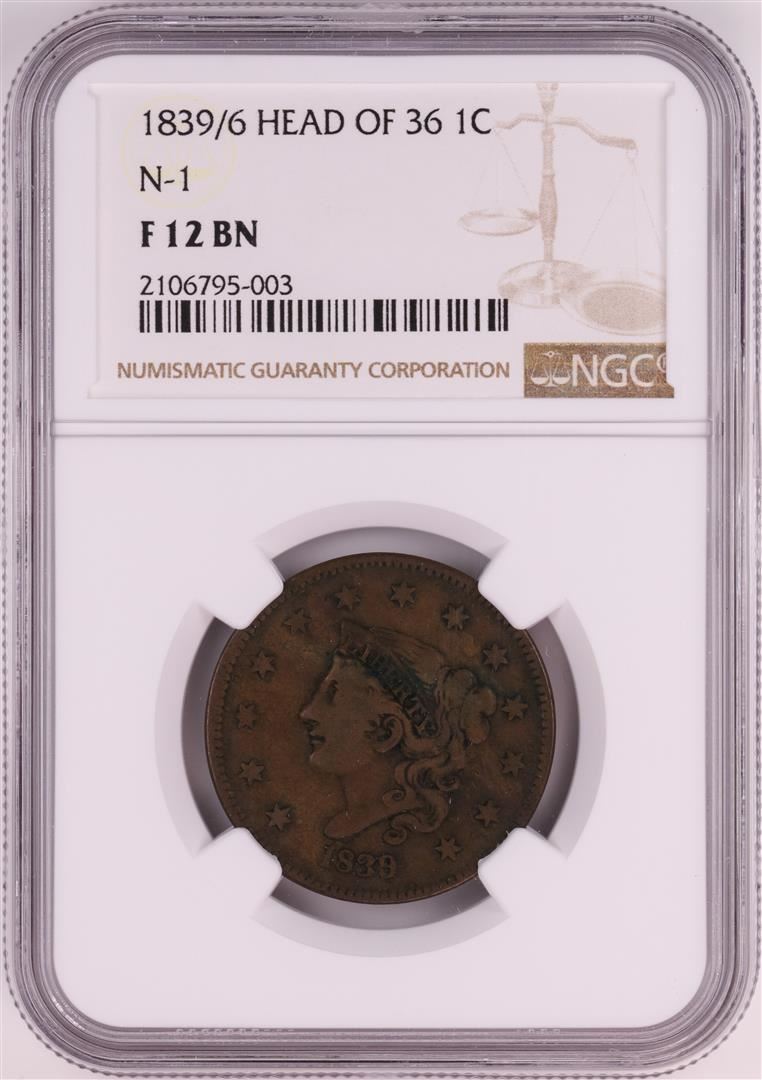 One 1839/6 Head of 36 N-1 Coronet Large Cent Coin NGC F12 BN. NGC Certified.