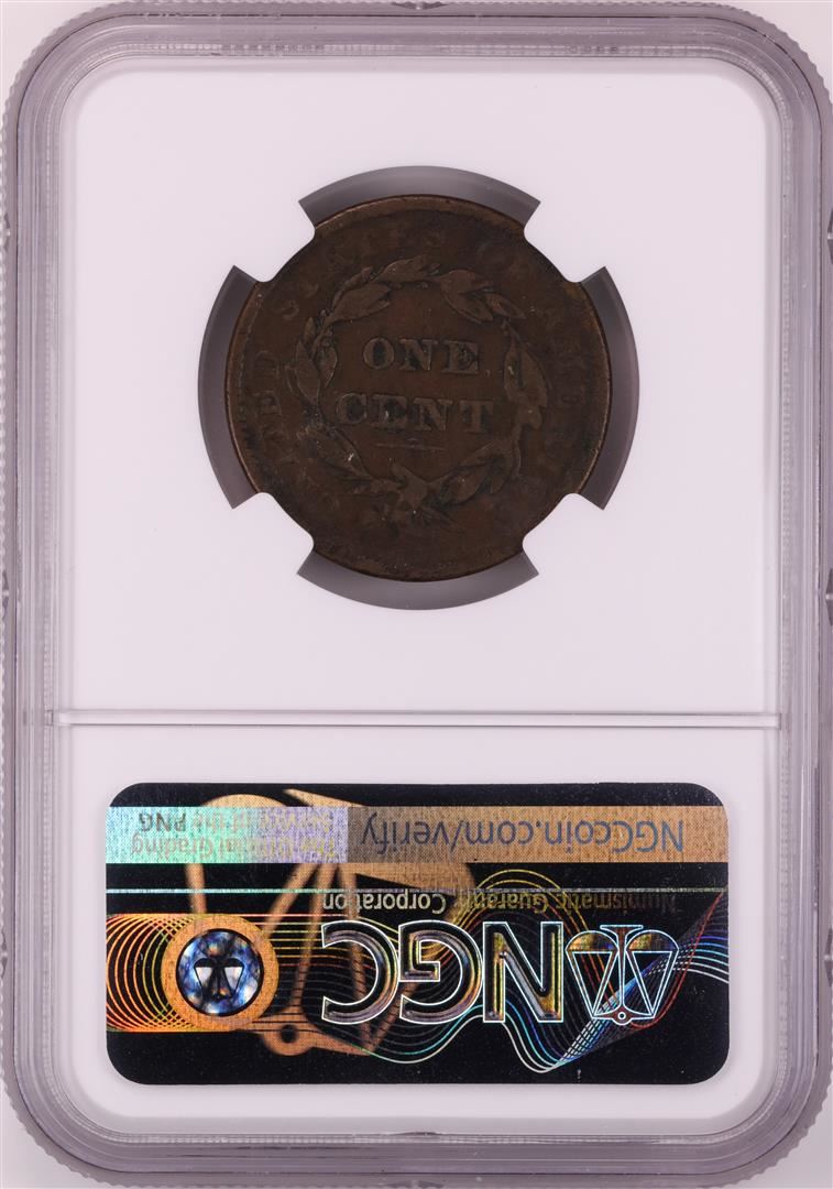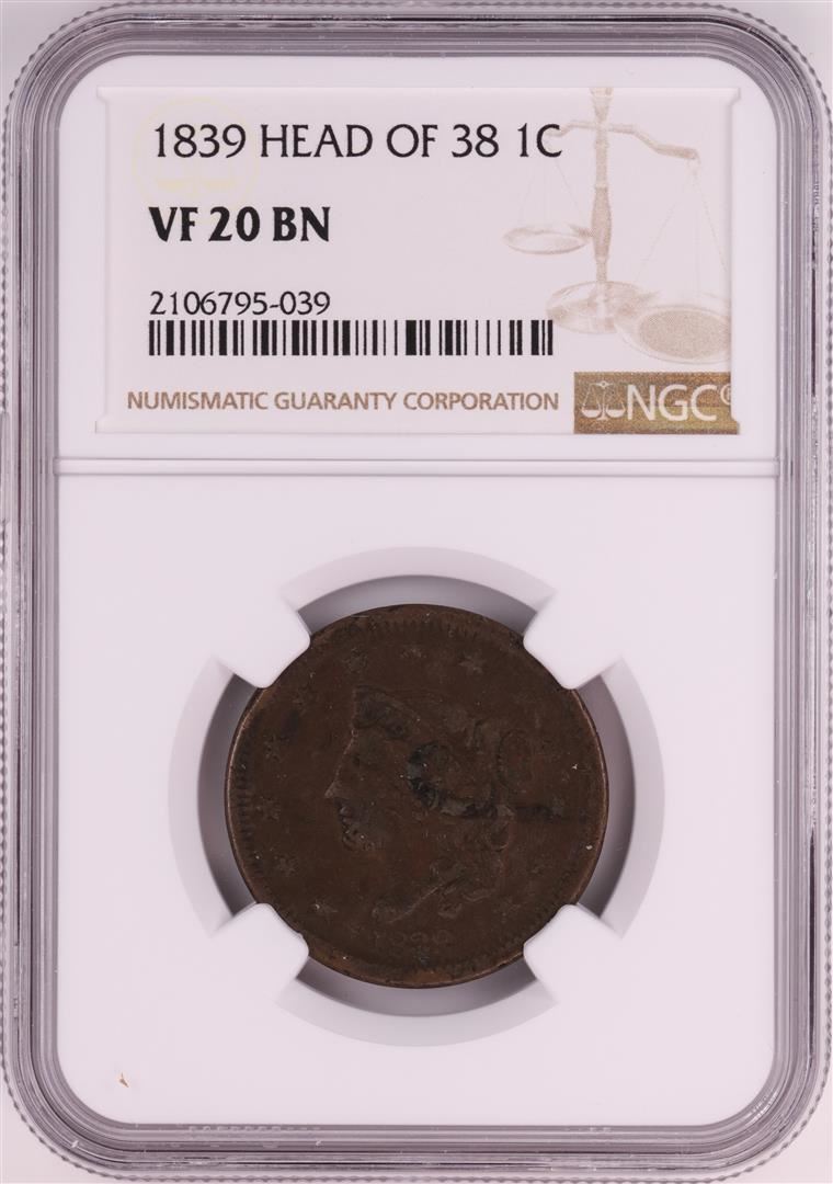 One 1839 Head of 38 Coronet Large Cent Coin NGC VF20 BN. NGC Certified.