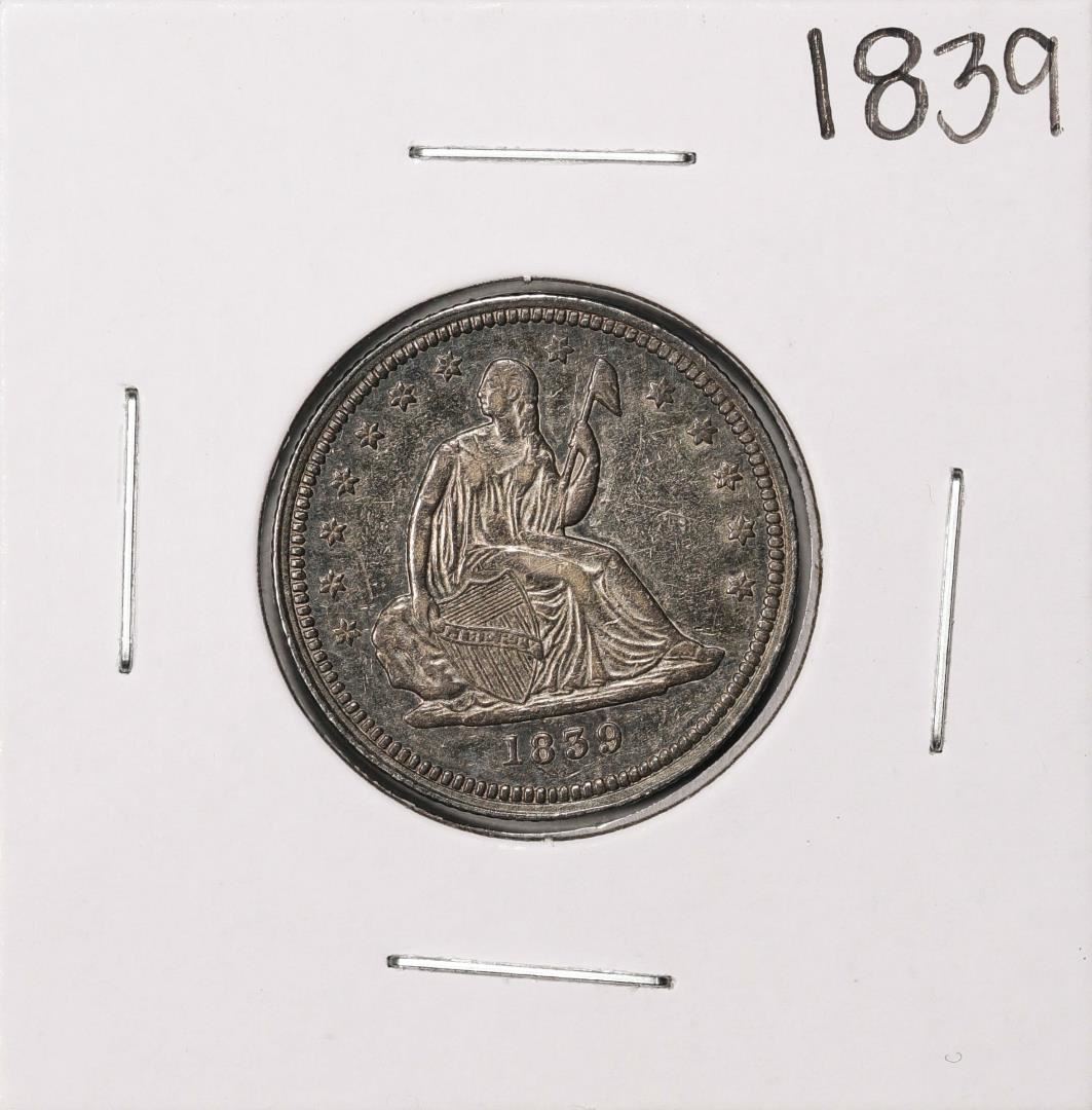 One 1839 Seated Liberty Quarter Coin.