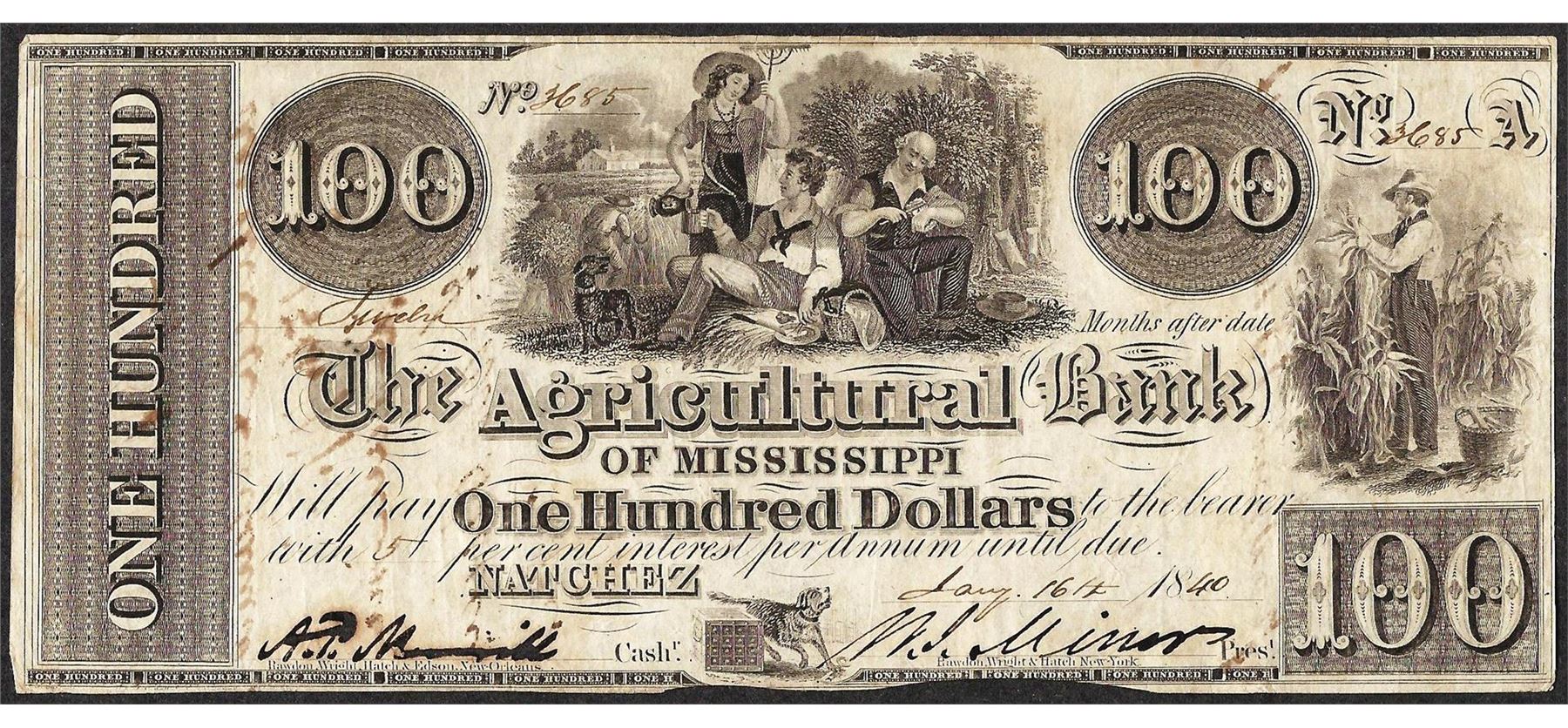 One 1840 $100 Agricultural Bank of Mississippi Natchez Obsolete Note.
