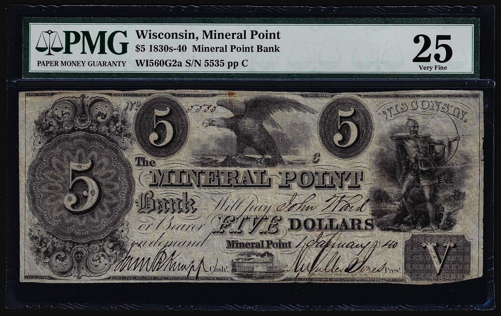 One 1840 $5 Mineral Point Bank Wisconsin Obsolete Note PMG Very Fine 25. PMG Certified.