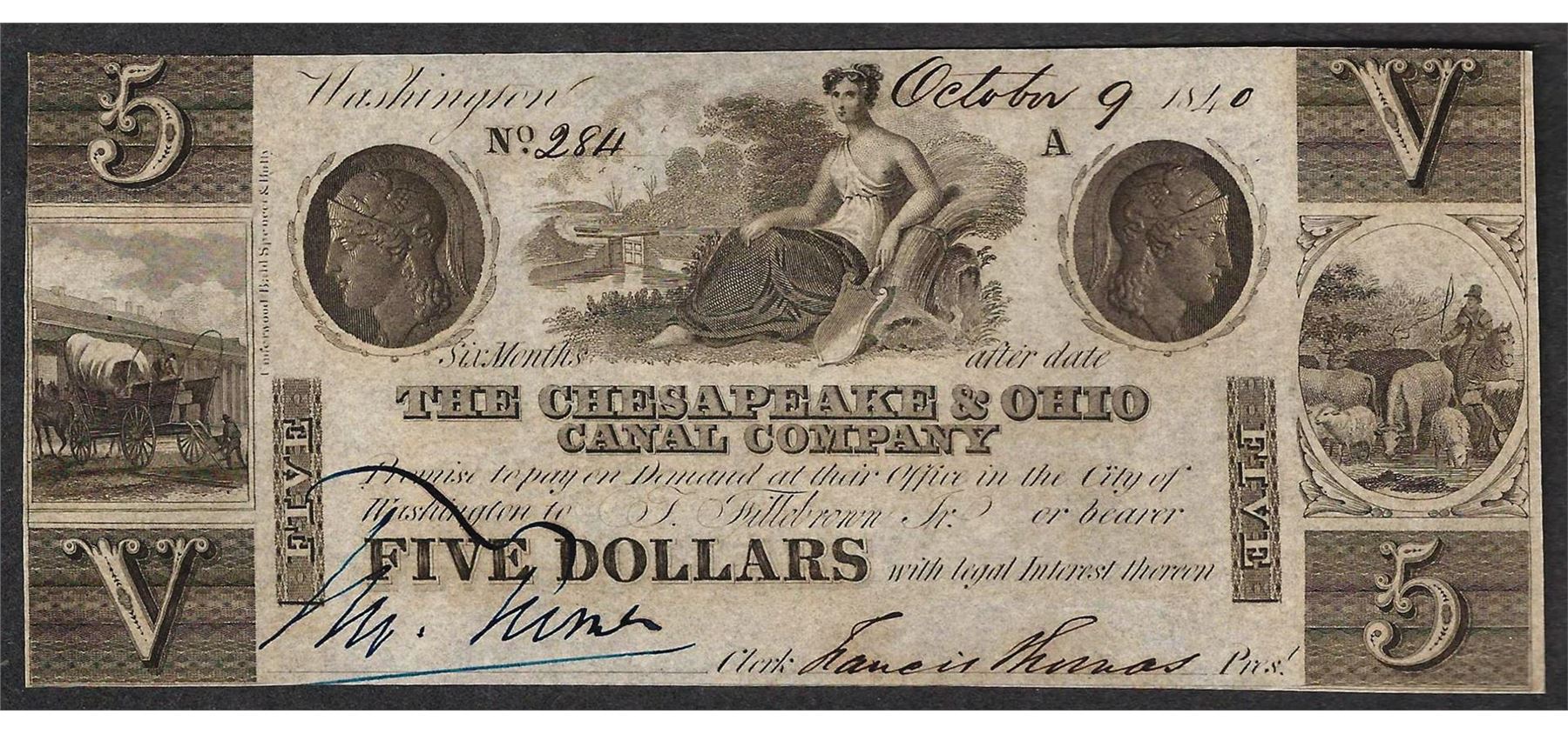 One 1840 $5 The Chesapeake & Ohio Canal Company Obsolete Bank Note.