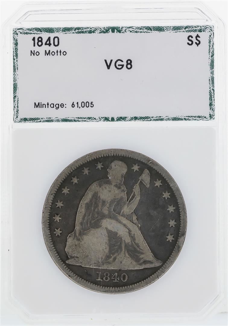One 1840 NM $1 Seated Liberty Silver Dollar Coin PCI VG8. PCI Certified.