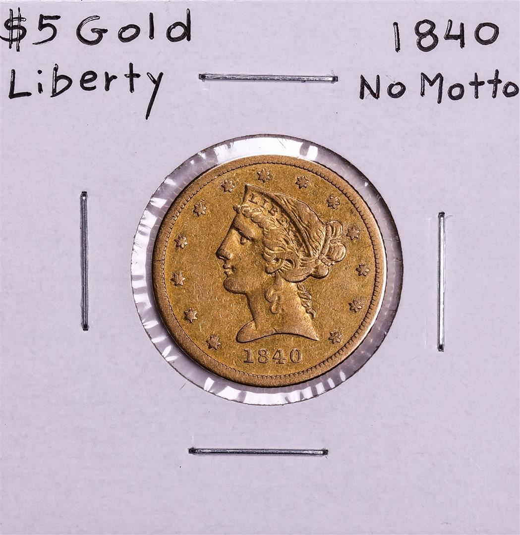 One 1840 No Motto $5 Liberty Head Half Eagle Gold Coin.