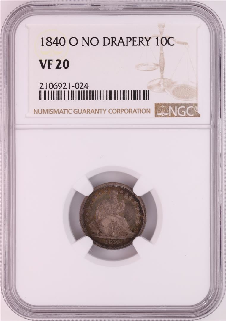 One 1840-O No Drapery Seated Liberty Dime Coin NGC VF20. NGC Certified.