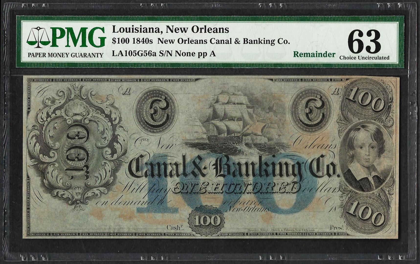 One 1840's $100 New Orleans Canal & Banking Co. Obsolete Note PMG Choice Uncirculated 63. PMG Certified.