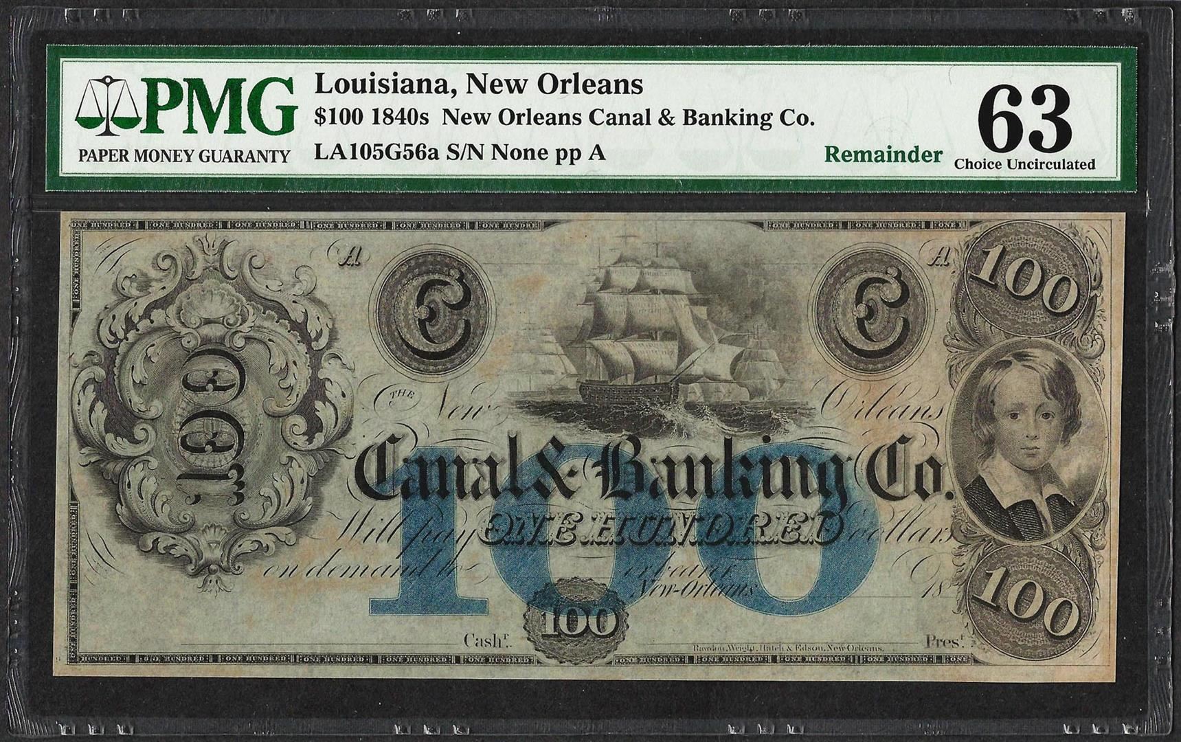 One 1840's $100 New Orleans Canal & Banking Co. Obsolete Note PMG Choice Uncirculated 63.