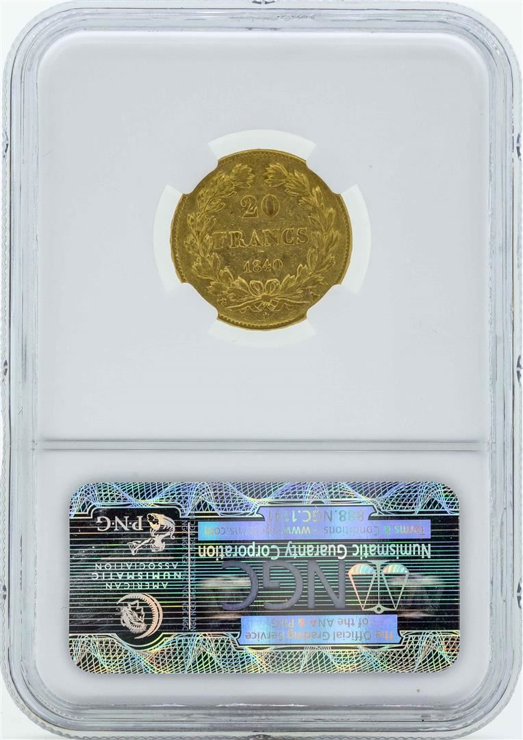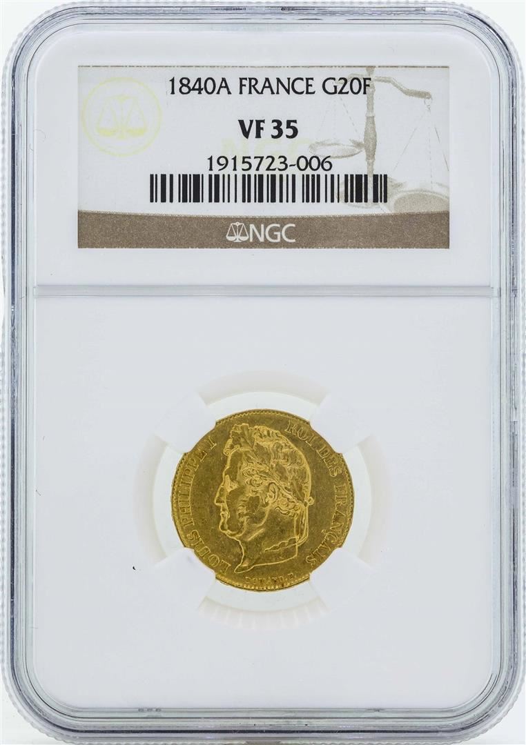 One 1840A France 20 Francs Gold Coin NGC VF35. NGC Certified.
