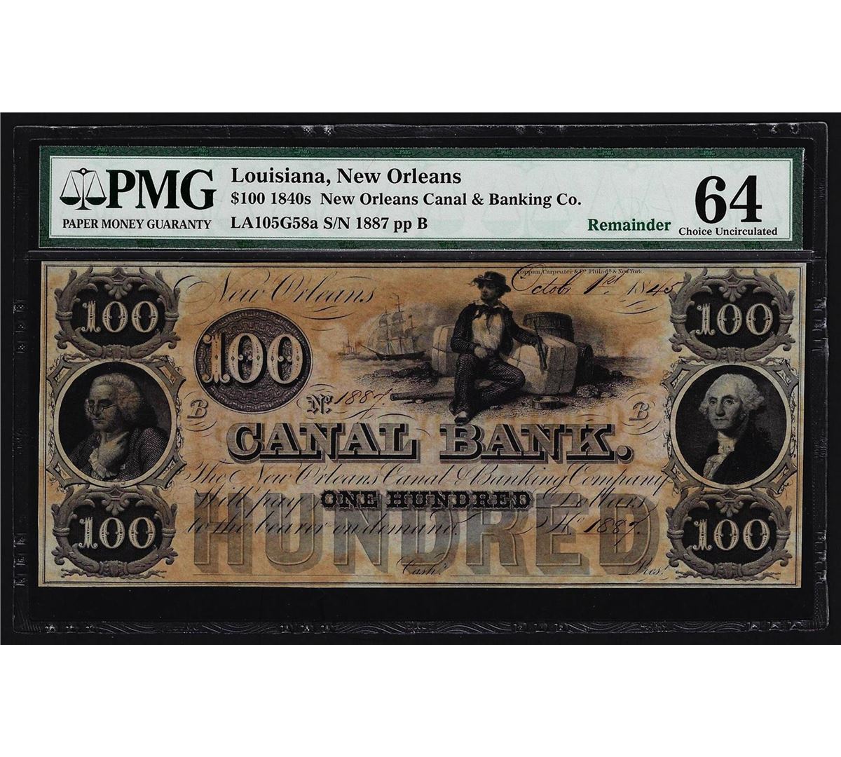 One 1840s $100 Canal Bank New Orleans Obsolete Note PMG CU64. PMG Certified.
