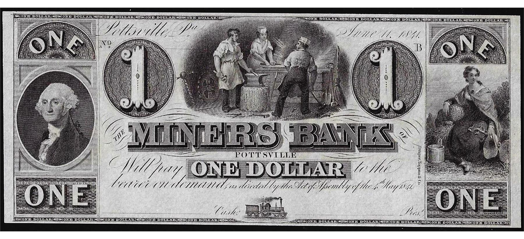 1841 $1 Miners Bank Pottsville, PA Obsolete Note