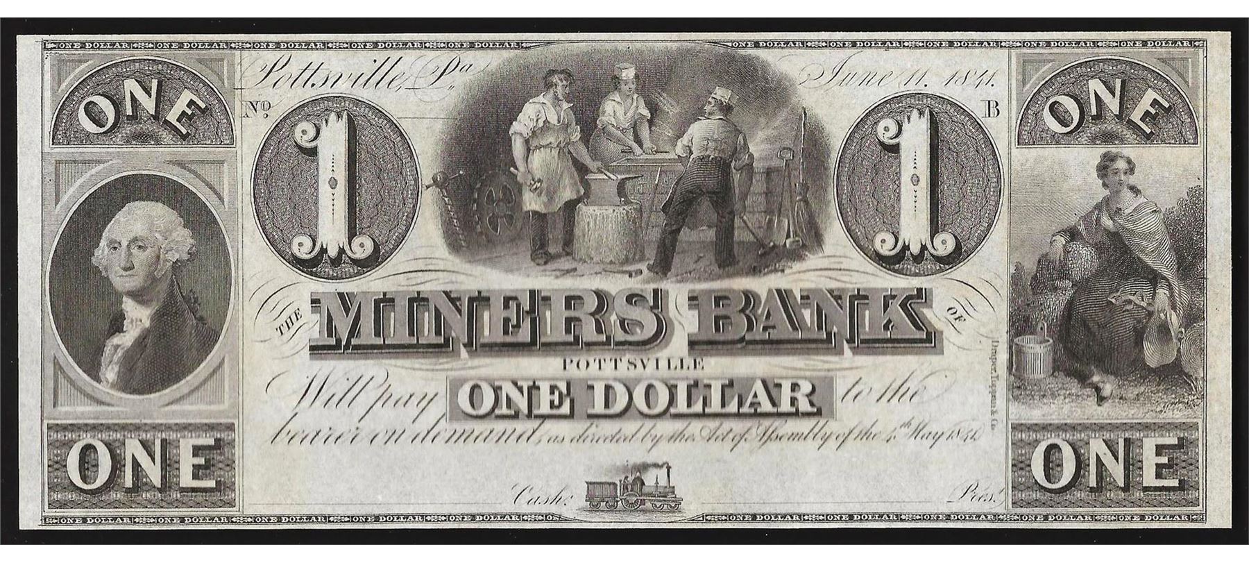 One 1841 $1 The Miners Bank Pottsville Obsolete Bank Note.