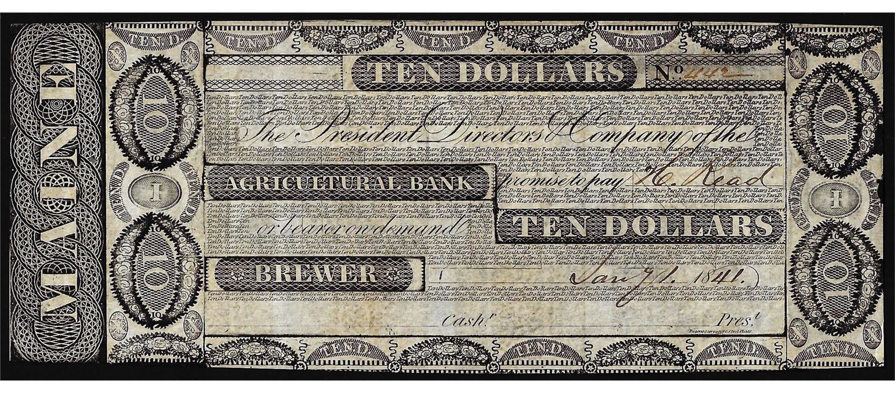 One 1841 $10 Agricultural Bank Brewer, Maine Obsolete Banknote.