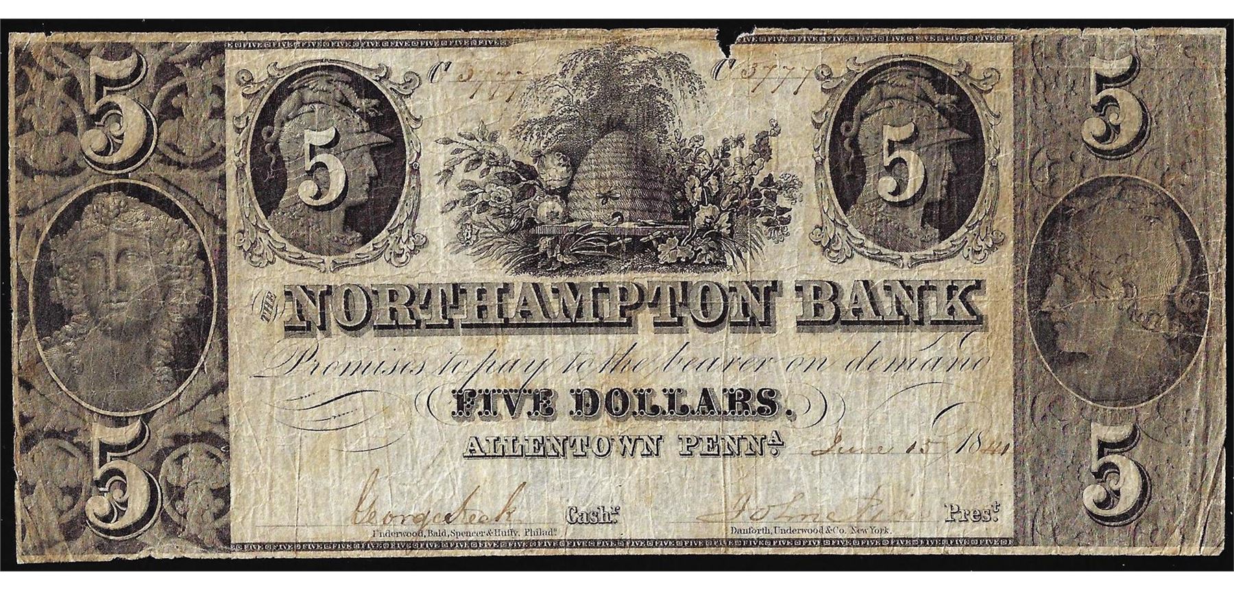 1841 $5 The Northampton Bank Allentown, PA Obsolete Note