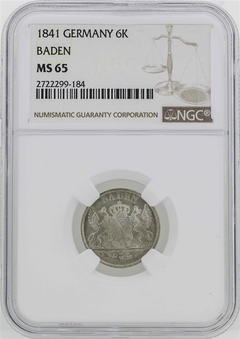 One 1841 Germany Baden 6 Kreuzer Coin NGC MS65. NGC Certified.
