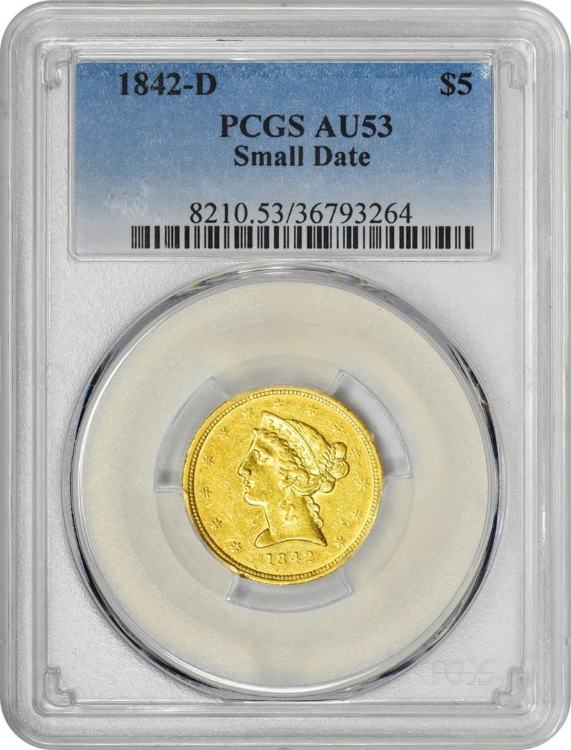 One 1842-D $5 Liberty Head Half Eagle Gold Coin PCGS AU53 Small Date. PCGS Graded.