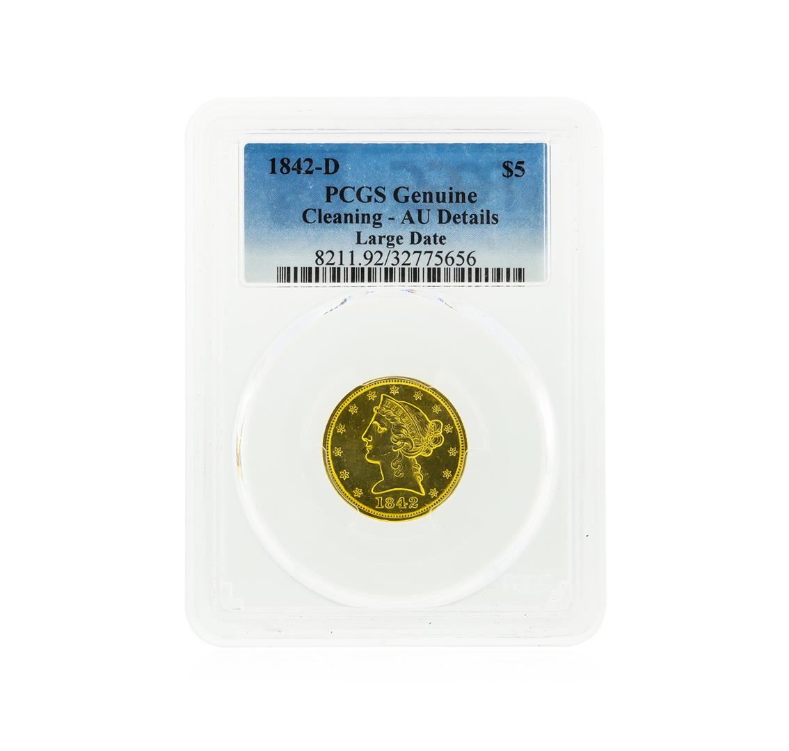 One 1842-D $5 Liberty Head Large Date Gold Coin, PCGS Graded AU Details Cleaning. PCGS Graded.