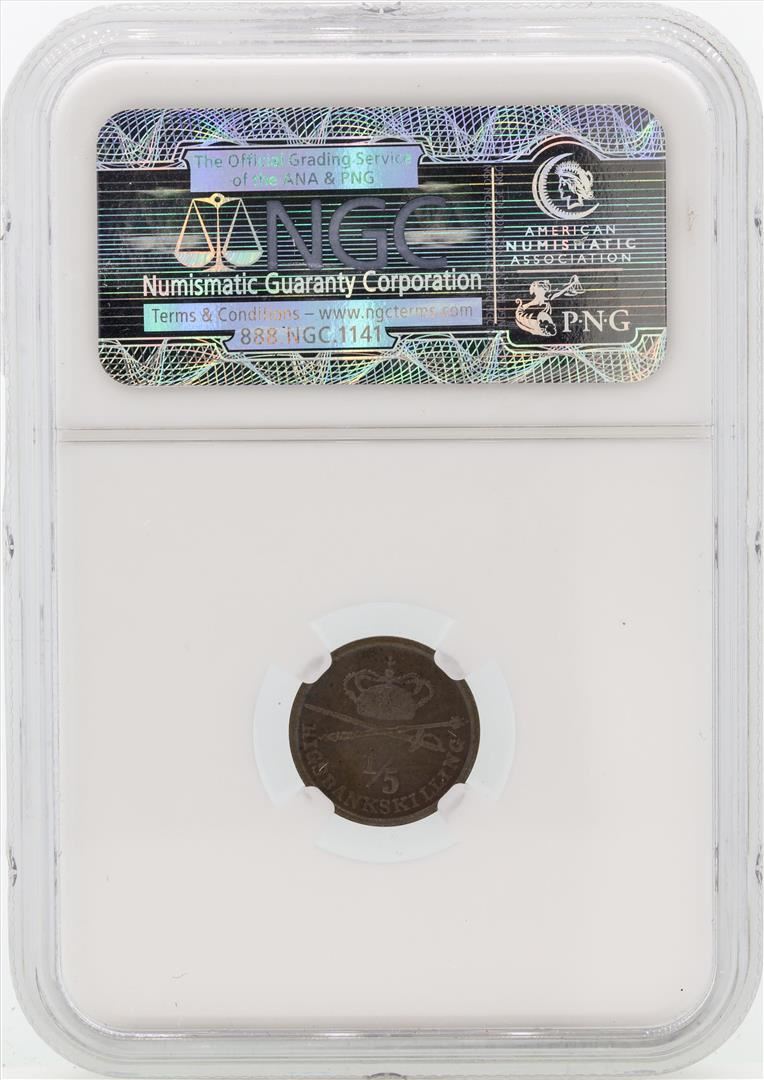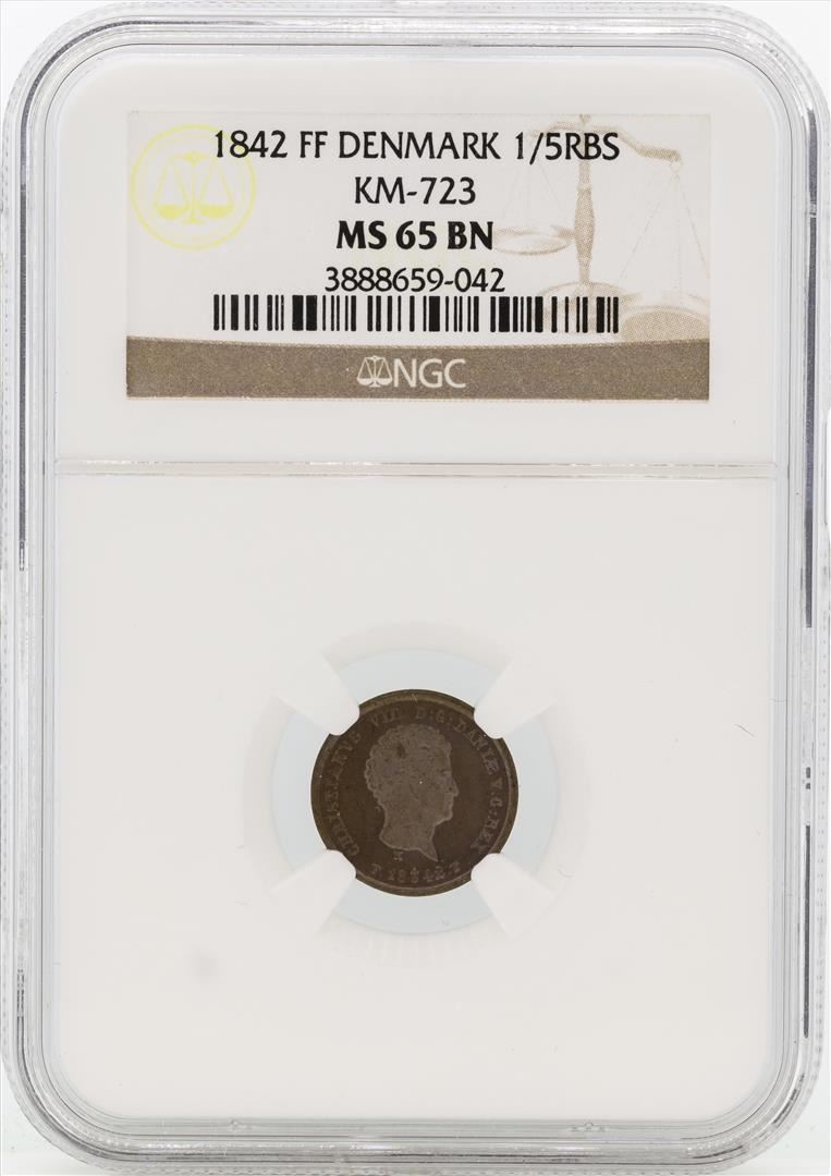 One 1842FF Denmark 1/5 Rigsbankskilling KM-723 NGC MS65 BN. NGC Certified.